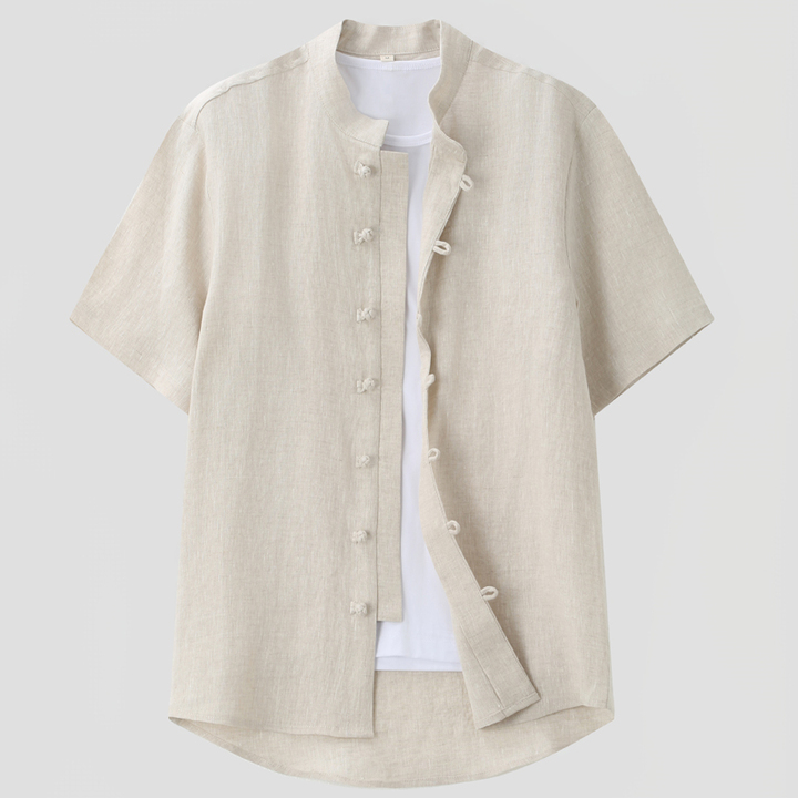 Camiseta Retro informal de lino de media manga para hombre, camisa de manga corta de lino 100% con estampado de estilo chino, botones superiores finos sueltos de verano
