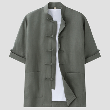 เสื้อลินินสไตล์จีนสำหรับผู้ชายชุดถัง100% ผ้าลินินแบบติดกระดุมตั้งได้เสื้อครึ่งแขนลำลองพิมพ์ลายระบายอากาศ